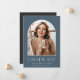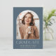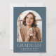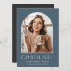 Élégant faire-part de graduation photo dispose d'une photo verticale ou portrait orientés dans un agencement unique voûté, sur un arrière - plan bleu poussiéreux. "Graduate" apparaît ci-dessous, ainsi que le nom de votre diplômé et l'école ou le collège. Ajoutez un message personnel à l'arrière, ainsi qu'une photo supplémentaire.