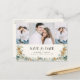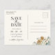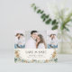 Cet élégant hiver boho Save the Date photo carte postale avec une belle aquarelle peinte à la main feuilles et baies bleu poussiéreux, fleurs d'anémones crème, vert sauge et pinecones disposés comme un cadre élégant sur un ivoire | arrière - plan crème avec 3 photos. Le verso comprend du texte pour la personnalisation. Trouvez les articles correspondants dans la collection de Mariages Floraux Bleus Dusty d'hiver.