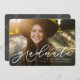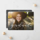Un diplômé en écriture simple et ludique se trouve au bas d'une photo horizontale. Le texte personnalisé comprend la place pour le nom du diplômé ainsi que les détails de l'école et de l'année. Le dossier gris neutre est doté d'un simple motif de grille, et la couleur peut être changée en cliquant sur "customiser plus loin". Annoncez la réalisation de votre diplômé à vos amis et à votre famille avec ce design!