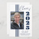Classe de 2025 élégante faire-part de graduation élégante avec rayures bleu marine, cadre photo et texte sur un arrière - plan blanc.