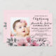Une invitation de baptême photo élégante et rose que vous pouvez personnaliser et envoyer à vos invités pour la célébration de votre événement de baptême. Tous les textes sont définis à l'aide d'une typographie populaire. Un motif floral complète l'avant et l'arrière de l'invitation sur un fond rose doux. Profitez!