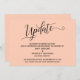 La distinction de cette suite est due à la police de caractères cursive élaborée utilisée pour les phrases d'accent. Dans le cas où vous auriez besoin d'informer vos invités que votre mariage a été annulé, cette carte offre une option élégante. Dans ce modèle, la police de calligraphie a été utilisée pour créer un graphique représentant le mot " Mise à jour ". Utilisez les champs du modèle pour ajouter vos informations personnelles et faire de ce design le vôtre. L'arrière-plan peut être changé en n'importe quelle couleur de votre choix. N'hésitez pas à nous contacter pour toute demande spéciale ou pour une aide à la personnalisation. // 98 //