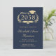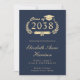Elegant dark navy blue college graduation announcement featuring the graduate's class year in a light gold illustration of a laurel crest incorporating a grad cap topper and diploma, their name in a light gold classic script, and their school, major, honors or future plans. Add their photo and a personalize message on the back.