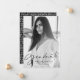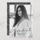 Faire-part moderne de graduation avec la photo verticale du diplômé avec "Graduate" dans une superposition de script noir élégant. Personnalisez le devant du faire-part de remise de diplômes en y ajoutant le nom du diplômé, le nom de l'école et l'année de remise de diplômes. Le dos de la faire-part de graduation branchée est orné d'un motif noir et blanc dessiné à la main.