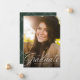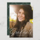 Un script classique et élégant diplômé en blanc se trouve au bas d'une photo verticale. Le texte personnalisé comprend la place pour le nom du diplômé ainsi que les détails de l'école et de l'année. Le dossier vert chasseur a un simple motif de grille, et la couleur peut être changée en cliquant sur "customiser plus loin". Annoncez la réalisation de votre diplômé à vos amis et à votre famille avec ce design!