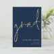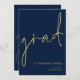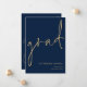 Élégant Script Navy Gold GraduatIon Faire-part Cette simple typographie or sur le design bleu marine classique pour annoncer la nouvelle de votre diplômé a établi un script de style manuscrit pour l'en-tête principal, grad, et facile à personnaliser typographie en bas à droite avec vos détails et aussi votre message au dos.