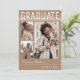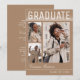 Cartes de faire-part de graduation tendance, moderne et élégant, avec éléments de conception du texte moderne avec écriture manuscrite script signature. Trois photos d'études supérieures mettent en évidence le devant de la carte avec "Graduate" accentué dans un dégradé blanc élégant. Le dos de la carte offre des espaces de texte personnalisés pour des informations sur votre graduation et votre futur voyage. Écriture blanche sur beige taupe chic ou customisez facilement l'arrière - plan pour correspondre à la couleur primaire de votre école ou à toute couleur de votre choix. Parfait pour les diplômes du lycée, du collège et de l'université.