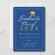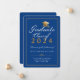 Annoncez votre diplôme d'études supérieures en style avec cette élégante classe personnalisée de 2023 carte de faire-part diplômée. Ce design de typographie formel comprend les mots Classe de fin d'études du 20XX avec votre diplôme, nom, école, et date pour personnaliser en or et blanc script accentué par un faux casquette diplômé en or et encadré en or sur un arrière - plan bleu royal. Le dos de la carte est bleu royal. Conçu par Susan Coffey.