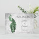Personnalisez un faire-part mariage unique avec un paon vert émeraude Enregistrer la date. Le design de faire-part comprend un paon élégant contre le feuillage délicat et l'arrière - plan grunge et le texte que vous pouvez personnaliser avec vos détails de date mariage. Enregistrez également l'annonce de date disponible pour ce design dans une variété de couleurs.