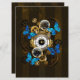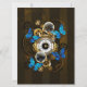 Composition de l'horloge ronde steampunk avec cadran romain noir, décoré avec des engrenages or et laiton, papillons Morpho bleu et lentilles endommagées sur arrière - plan rayé brun. Style Steampunk.