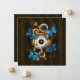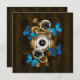 Composition d'une horloge ronde steampunk avec cadran à chiffres romains noirs, décorée de rouages en or et laiton, de papillons Morpho bleus et de lentilles endommagées sur fond brun rayé. Style steampunk.