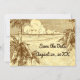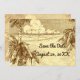 Une carte d'annonce personnalisée Save the Date avec des lettres de script et de serif sur une gravure vintage marron de palmiers sur une plage de sable et de beaux nuages sur des vagues océaniques calmes sur un arrière - plan faux parchemin, et espace pour vos informations et dates au verso.