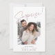 Vous n'avez pas encore fixé la date, mais vous êtes impatient de partager les bonnes nouvelles avec votre famille et vos amis ? Annoncez votre fiançailles avec ces cartes photos simples et légers, avec une photo verticale ou orientée portrait avec "surprise !" superposée en haut, en lettres esquissées à la main. Personnalisez avec trois lignes de texte personnalisé en bas, y compris votre faire-part, vos noms et une note pour rester à l'écoute pour plus de détails.