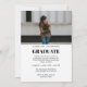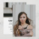 Une invitation de remise des diplômes moderne et élégante avec un script stylé, une superposition de texte et deux (2) photos (une photo de portrait complète à l'avant et une photo de paysage en demi-carte à l'arrière). Les photos et les détails sont faciles à personnaliser.