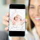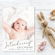 Une carte moderne pour annoncer la naissance de votre petite fille, avec sa photo surimposée de « Faire connaissance » dans un script élégant avec un flourish en forme de cœur. En dessous, ajoutez son nom, sa date de naissance et ses statistiques de naissance. Au dos, ajoutez trois photos supplémentaires et un message personnalisé sur un fond rose pastel.