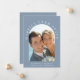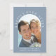 Élégante annonce de mariage ou d'union privée ou réception de mariage en bleu poussiéreux. Le devant présente votre photo de mariage dans un cadre cintré et "Heureux pour toujours" en typographie blanche élégante. Ajoutez vos prénoms, date de mariage et lieu. Au verso, personnalisez votre annonce de mariage et votre invitation de réception et ajoutez vos noms dans un script ressemblant à une signature.