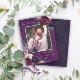 Des fleurs romantiques aux nuances de bordeaux riche, de lilas tendre, de violet aubergine profond et d'orchidée roseâtre se combinent avec des plantes botaniques vertes modernes telles que des fougères et de l'eucalyptus. Un fond aquarelle violet aubergine profond lie le tout avec une typographie moderne élégante dans ces cartes de faire-part photo.