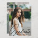 Cette annonce de remise de diplôme élégante présente un texte manuscrit noir sophistiqué superposé à une photo tendance pleine de votre diplômé. Personnalisez cette carte de diplômé avec une 2ème photo de lycée, de collège ou d'université au verso sous vos coordonnées de finissant. La photo du verso est recouverte d'un blanc transparent stylé pour un look moderne pour votre carte.