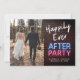 Faire-part d'annonce de mariage intime ou d'élopement moderne et invitation à une réception pour informer la famille et les amis que vous vous êtes mariés lors d'une petite cérémonie de mariage intime, et les inviter à une réception ou une fête de mariage. Le recto présente votre photo de mariage et "Happily Ever After Party" dans un mélange de typographie blanche cursive et rouge et bleue avec un effet de néon lumineux sur fond de mur de briques. Au verso, vous pouvez personnaliser votre message de manière plus détaillée et vos noms dans une écriture ressemblant à une signature.