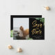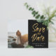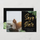 Feuilles tropicaux exotiques et script doré, enregistrez le carte photo de date. La carte est dotée d'un design typographique moderne en pinceau doré avec des bordures de feuillage tropicales luxuriantes sur un arrière - plan noir classique. Modèle photo unique sur le devant avec des lignes pour les noms et la date.