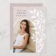 Le faire-part de graduation chic et moderne comprend une seule photo verticale/portrait en forme d'arc, avec des vignes d'escalades de feuilles botaniques blancs sur le côté droit. Personnalisez avec le nom de votre diplômé, l'année de cours et l'école et ajoutez un message personnel à l'arrière, ainsi qu'une photo supplémentaire.