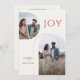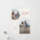 Ces cartes de voeux plates de 5 po x 7 po comportent des espaces réservés pour trois photos, deux noms, une année et un message. L'avant a deux photos voûtées, une verticale et une horizontale. L'accueil est "Joy", en lettres rouges. L'arrière - plan est l'ivoire. Le dos a une photo verticale. Le message personnalisable dit : "Nous sommes ravis d'annoncer que nous sommes devenus engagés, et nous vous souhaitons à la fois paix et joie pour les fêtes et pour l'année à venir."
