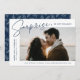 Partagez les nouvelles de votre fiançailles surprise avec ces annonces élégantes de fiançailles photo. Le design comporte l'expression "Surprise, nous nous sommes engagés !" dans un script de marine branché et des lettres modernes. Votre photo fiançailles est présentée dans la partie centre-droit du design avec vos noms et la date fiançailles affichés à gauche. Personnalisez le faire-part fiançailles surprise en ajoutant des détails supplémentaires ci-dessous tels que la ville/l'état mariage, le site Web mariage, etc. La faire-part s'inverse pour afficher un motif de feuillage blanc sur un arrière - plan de la marine.