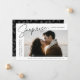 Partagez les nouvelles de votre fiançailles surprise avec ces annonces élégantes de fiançailles photo. Le design comporte l'expression "Surprise, nous nous sommes engagés !" dans un script noir tendance et des lettres modernes. Votre photo fiançailles est présentée dans la partie centre-droit du design avec vos noms et la date fiançailles affichés à gauche. Personnalisez le faire-part fiançailles surprise en ajoutant des détails supplémentaires ci-dessous tels que la ville/l'état mariage, le site Web mariage, etc. La faire-part inverse pour afficher un motif de feuillage blanc sur un arrière - plan noir.
