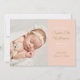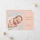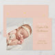 Carte de naissance de bébé fille moderne avec écriture dorée pour annoncer la naissance de votre beau bébé. Le recto comporte une photo de votre bébé ainsi que du texte chic doré et blanc pour le nom et les informations de naissance de votre bébé sur un panneau pêche que vous pouvez personnaliser à la couleur de votre choix. Le verso présente des étoiles dorées sur des ficelles sur un fond pêche assorti. Conçu par Thisisnotme