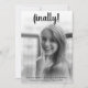 Carte de faire-part moderne de graduation avec "enfin" dans une épaisse écriture manuscrite en noir avec le nom du diplômé et les informations de l'école sur votre photo verticale préférée. Le côté arrière a votre message personnel en noir sur un arrière - plan blanc. Un design simple qui fait de votre photo la caractéristique principale. Cette conception fonctionne pour un garçon ou une fille diplômé.