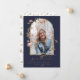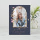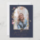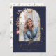 Une jolie carte de faire-part graduation avec votre photo en forme d'arc dans un cadre doré avec fleurs sauvages et feuilles aquarelle en rose et vert. L'arrière - plan est en bleu marine. "gradué" est en or de la police de calligraphie moderne. Le verso est doté d'un motif de fleurs sauvages aquarelles.