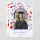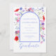 Coloré moderne fleur sauvage photo diplômé de l'école secondaire carte de faire-part de diplôme avec élégant script de typographie moderne en cornflower avec arche encadrée bleue. De belles aquarelles florales d'été comprennent des pavots, des fleurs de maïs et des feuilles d'art original de l'artiste Catherine Sweetman.