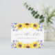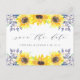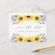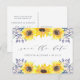 Des cartes postales de sauvegarde de date élégantes et rustiques à motif floral aquarelle présentent "save the date" en lettrage calligraphique chic avec vos noms et date de mariage en dessous. Des trios de tournesols aquarelle jaune avec un feuillage vert vibrant et de petits bourgeons de fleurs sauvages bleu marine terminent le look. Coordonne avec notre collection de papeterie Flowerfields pour des mariages champêtres chic.