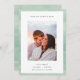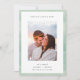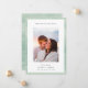 Des cartes d'annonce de fiançailles minimalistes chic présentent une photo verticale ou en portrait sur un fond blanc avec une fine bordure de bandes aquarelles dans des nuances éthérées de vert sauge. "Forever Starts Here" apparaît en haut dans une écriture moderne, avec votre annonce, vos noms et des détails supplémentaires en bas.