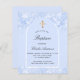 Un fond bleu clair et un cadre en arche. Décoré de confettis bleu clair. Personnalisez avec un nom et les détails de la cérémonie. Style d'écriture élégant à la main.