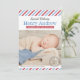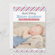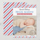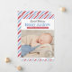Carte d'annonce de naissance photo inspirée de l'ancien avec un en-tête de script "Livraison Spéciale" et le nom du bébé en caractères gras serif, les statistiques de naissance sur une bannière de ruban rouge et un timbre-poste "Notre Bébé Garçon Est Arrivé". Des bandes diagonales rouges, blanches et bleues encadrent le design avec un message "Accueilli Avec Amour" ci-dessous. Le dos continue le motif de bandes de courrier aérien. Tout le texte et les couleurs sont entièrement personnalisables.