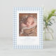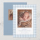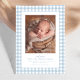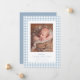 Présentez votre nouveau-né avec cette annonce de naissance bleue à carreaux douce et simple. Le devant du design classique présente un cadre à carreaux bleus et blancs avec une seule photo verticale ainsi que du texte personnalisable et beaucoup de place pour le nom du bébé, la date de naissance, les statistiques et plus encore. Le dos est un bleu poussiéreux coordonné avec des points blancs et comporte un espace pour une deuxième photo. Ce design fait partie de la collection "oh baby" à carreaux de Lea Delaveris Design et est également disponible dans d'autres couleurs et en téléchargement numérique d'annonce de naissance. Trouvez des pièces coordonnées comme des enveloppes, des doublures d'enveloppe, des cartes de remerciement et plus encore dans la collection.
