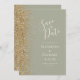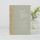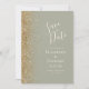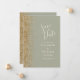 Le bord gauche de cet élégant mariage moderne, à l'exception de la carte de date, est orné d'une bordure de parties scintillant en faux or. Le texte personnalisable combine écriture ivoirienne, copperplate et polices italiques sur un arrière - plan vert sage. L'envers est assorti d'un design vert sauge et or.