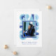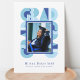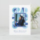 Retro-style, yet modern, graduation announcement photo card that features the word "GRAD" designed with geometric shapes in various colors that form a border around the photo of the graduate. Retro colors—blue, teal, white—add to the card's retro style.