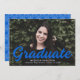 Faire-part de graduation simple et élégante avec la photo horizontale du diplômé avec "Graduate" dans une écriture bleue audacieuse. Personnalisez le faire-part de remise de diplômes photo en ajoutant le nom du diplômé, le nom de l'école et l'année de remise de diplômes. La faire-part s'inverse pour afficher un motif d'arc géométrique bleu et blanc.