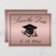 Annoncez votre prochain diplôme en style et demandez à vos proches et amis d'enregistrer la date avec cette élégante carte à plat. Le design comporte un arrière - plan en or rose faux avec les mots "Save the Date" en script noir. Une casquette noire et un diplôme accent du centre et en dessous est la date à laquelle vous pouvez personnaliser. Le verso de la carte contient plus d'informations sur la personnaliser de votre journée de remise des diplômes. Conçu par l'artiste ©Susan Coffey.