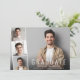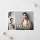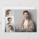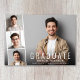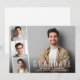 Carte à plat minimal moderne de graduation avec la photo du diplômé superposée avec une bande de trois plus petites photos de carré et "Graduate", leur nom, l'école et l'année de classe en simple typographie blanche.