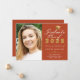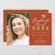 Annoncez votre graduation en style avec cette élégante carte de faire-part photo personnalisée. Ce design a votre photo sur la gauche et à droite un design typographique avec les mots Classe Graduate de 20XX avec votre nom, l'école, et date pour personnaliser en or et blanc script accentué par un faux casquette diplômé en or sur un arrière - plan orange. Le dos de la carte est orange. Conçu par Susan Coffey.