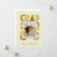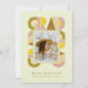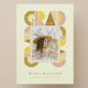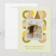 Retro-style, yet modern, graduation announcement photo card that features the word "GRAD" designed with geometric shapes in various colors that form a border around the photo of the graduate. Retro colors—yellow, pink, brown, and green—add to the card's retro style.