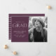 Célébrez le jalon excitant de votre diplômé avec ces annonces uniques de diplôme de photographie! Le design comporte des "félicitations à notre diplômée" en lettres modernes blanches avec un arrière - plan violet avec un bord déchiré en bordure de la photo senior du diplômé. Personnalisez le faire-part en ajoutant le nom du diplômé, le nom de l'école et l'année de fin d'études. La carte inverse pour afficher un motif rayé blanc et violet texturé.