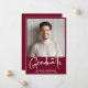 Faire-part moderne de graduation rouge bordeaux avec votre photo et "Graduate" dans un élégant script blanc audacieux. Ajoutez le nom, l'école et l'année de classe de la jeune fille en simple typographie blanche.