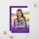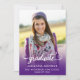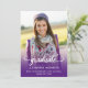 Ajoutez votre portrait photo personnel pour créer un joli compte de fin d'études secondaires pour votre fille. L'image graphique "Graduate" a un script décoratif avec des swashes... vous pouvez changer la couleur de ce graphique vectoriel. Le revêtement arrière - plan et dégradé présente une jolie teinte de violet royal. La police simple pour son NOM, LE LYCÉE, et LA CLASSE DE 2025 et le message faire-part sur le dos peut être customisé au besoin.