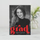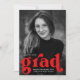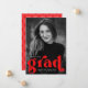 Annonces de fin d'études élégantes avec la photo verticale du diplômé avec "grad" en caractères rouges gras. Personnalisez le faire-part de remise de diplômes en photo en ajoutant le nom du diplômé, l'année de remise de diplômes et l'école. La faire-part s'inverse pour afficher un motif d'arc rétro rouge et blanc.