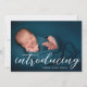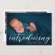 Announce the arrival of your baby with this personalized birth announcement card featuring a full-size newborn photo on the front. The elegant “Introducing” script highlights your baby’s name, creating a timeless and heartfelt first impression.