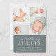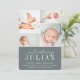 Les annonces de naissance élégantes comportent quatre photos de nouveau-nés disposées dans une grille de montage sur un arrière - plan vert sauge foncé. "Introduce [name]" apparaît sous le script de calligraphie chic et le lettrage de bloc classique. Personnalisez avec le nom complet du bébé, les statistiques de naissance et une signature de famille en bas. Un design simple et propre et neutre pour annoncer l'arrivée de votre petit.